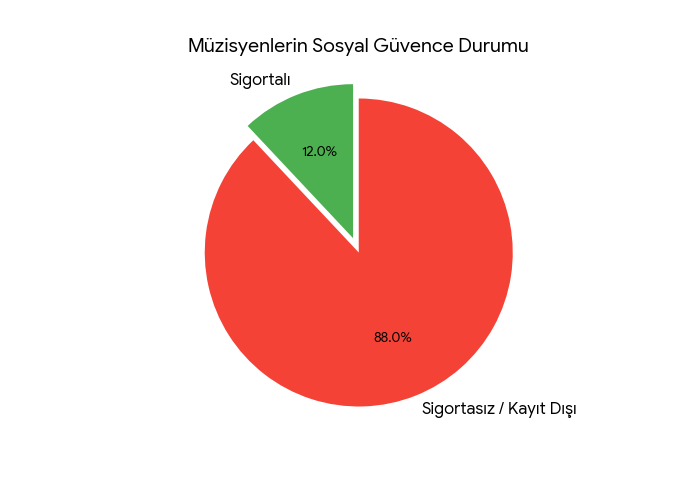 Müzisyenler için en temel sorunlardan biri sosyal güvenceye erişim. Proje bazlı işler, kayıt dışı çalışma ve düzensiz gelir, sigortalı sistemin dışında bırakıyor. Müzisyenler; sağlık sigortası, emeklilik hakkı ve iş güvencesi gibi haklara erişmekte sorun yaşıyorlar. Müzisyenliğin genellikle “hobi” olarak algılanması da mesleği resmi politikaların dışında bırakıyor. Sistemde sunulan “isteğe bağlı sigorta” gibi seçenekler de, çoğu zaman düzensiz gelir durumuyla örtüşmediği için kalıcı bir çözüm sunamıyor.